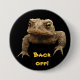 Eine mürrische schauende amerikanische Kröte (Bufo americanus) betrachtet heraus Ihnen von diesem Knopf. Diese kleine Amphibie ist mit Schwarzem, GoldOlivgrün und Orangenfärbung braun. Seine Warzen unterscheiden ihn von seinen Froschnachbarn. Obgleich ausgebrütet im Wasser von Teichen, Flüsse, Seen oder Ströme, bewegen sich die Tadpoles bald, um zu landen, wo die Kröten ihre erwachsenen Leben leben. Sein aufrüttelnder Anruf ist ein langer Schrei. Er schaut, ziemlich heftig aber ist wirklich ein leichter kleiner Typ, das Lose Gartenplagen einschließlich Insekten und Schnecken essen. Der Text liest: Ziehen Sie sich zurück. Er kann besonders angefertigt werden oder entfernt werden.