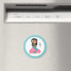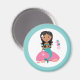 Niedlicher Kühlschrank- oder Schließmagnet mit einem afroamerikanischen Cartoon mit schwarzer Hautfarbe auf einem Stein mit Seestern und Seepferd auf weißem Hintergrund. Rund um den Pool verläuft eine türkisblaue Grenze. Spaß Design für Mädchen, auch mit braunen und blonden Haaren erhältlich.