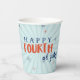 Alles Gute zum 4. Juli! Mit diesen Papiertassen mit stilvollen Feuerwerken und einem modernen Pinsel-Script-Schriftart auf einem hellblauen Sonnenbursthintergrund feiern Sie Ihr Party in Unabhängigkeit