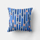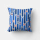 Dieses Kissen hat einen Amerikanische Unabhängigkeitstag-Design von senkrechten Linien in Blautönen, die durch Sterne von Rot und Weiß unterbrochen werden.
