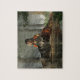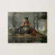 Eine Ureinwohner Amerikas sitzt mit ihrem Freund, einem grauen Wolf, an einem Teich im Wald. Die Sonne scheint durch die Blätter, um das Paar zu beleuchten. Die Frau sieht dich zuversichtlich an, dass ihr Beschützer sie vor dir behalte. Der Wolf sieht dich an, als wärst du zu Abend.