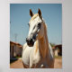 Foto eines herrlichen amerikanischen Pferdes unter den Häusern von Texas Ein Pferd arabischen Ursprungs mit einer schönen hellen Farbe