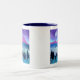 Eine abstrakte Landschaft mit einzigartigen Farben und Texturen, die eine Bergszene mit Bäumen und unangenehmen Nebel in lila, blauen, aquamarinen und zyanfarbenen Tönen zeigt.