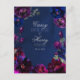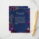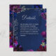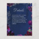 A stunning amethyst purple, sapphire blue and navy blue jewel tone wedding invitation Details enclosure card featuring a symphony of deep purple, burgundy and raspberry pink red peonies adorned with silver spray and shimmering silver outlines on a navy blue watercolor-wash background with your names in silver rustic script and a small uppercase non serif font announcing your details.