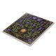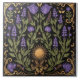 Symmetrische Blumenarrangements mit violetten Blumen, grünen Blätter und goldenen Akzenten auf goldenem Hintergrund, Sonne in der Mitte, Schmetterlinge und dekorativen Rahmen.