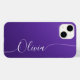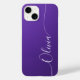 Amethyst Shimmer White Elegant Calligraphy Script Custom Personalisiert Name iPhone 14 Smart Phone Cases zeichnen sich durch ein modernes und trendiges, einfaches und stilvolles Design aus, mit Ihrem personalisierten Namen in elegantem handgeschriebenem Schriftzeichen Typografie auf metallischem Amethystyst-Shimmer-Hintergrund. Entworfen von ©Evco Studio www.zazzle.com/store/evcostudio