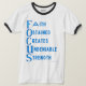Dieser Herren Ringer T - Shirt enthält das Wort "Focus" in einem hohen Kreuziser-Print-Schriftart, aus dem das Akronym mit den blauen Buchstaben (Glaube, Erstellt, Unbestreitbar, Stärke) in diesem AMMO Apparel USA Akronym Stil und Thema. Dieses Shirt hat ein Vintag inspiriertes Aussehen mit kontrastreichen Manschetten und Halsband für einen sportlichen, aber lässigen Look.