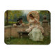 Dieses Design zeigt ein Gemälde des italienischen Künstlers Federico Andreotti (1847-1930). Es zeigt eine elegante junge Frau, die auf einer Steinbank in einem Parkland sitzt. Sie spricht mit ihrem männlichen Koffer, der neben ihr herumkauert. Die beiden Liebhaber haben ein romantisches Gespräch abseits der neugierigen Augen von Familie und Freunden. Die Dame trägt ein modisches weißes Kleid und hält einen Sonnenschirm, um sich vor der Sonne zu schützen. Der Herr trägt auch ein historisches Kostüm, das der Zeit angemessen ist. Auf der Bank neben der jungen Frau befindet sich ein Buch, das vielleicht die Liebe enthält, und einige rosa Rosen, die vielleicht von ihrem Bewunderer gegeben worden sind. Das Paar ist von schönen grünen Bäumen umgeben. Ein See oder ein Fluss fließen durch den Park.