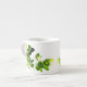 Diese kleine weiße Porzellan Espresso-Tasse kennzeichnet eine rotgeflügelte Amsel auf einer Niederlassungsweise oben in einem Espenbaum. Er späht heraus von hinten das goldene grüne Blätter. Das Bild wird auf dem Recht und den verlassenen Seiten wiederholt.