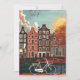 Eine Abbildung von Amsterdam in der niederländischen Hauptstadt zeigt reizvolle, farbenfrohe Häuser an einem Kanal, ein weißes Fahrrad im Vordergrund und Herbstbäume unter einem blauen Himmel mit fliegenden Vögeln.