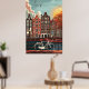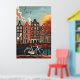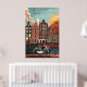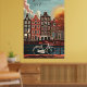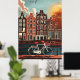 Eine Abbildung von Amsterdam in der niederländischen Hauptstadt zeigt reizvolle, farbenfrohe Häuser an einem Kanal, ein weißes Fahrrad im Vordergrund und Herbstbäume unter einem blauen Himmel mit fliegenden Vögeln.