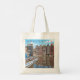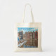 An illustration from a photograph of Amsterdam canal side houses printed on both sides of a tote bag.