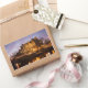 Rechteckiger Aufkleber mit Amsterdamer Kanalhäusern in traditionellem Stil neben einer Brücke über die Prinsengracht und die Brouwersgracht, die während der Blauen Stunde in den Niederlanden bei Dämmerung beleuchtet wird.