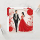 This is a stylized, romantic illustration of a couple, likely representing a bride and groom or a formal event like a prom or gala. The man is dressed in a sharp black tuxedo with a white shirt and black bow tie, accented with a white boutonnière. He has dark hair and a chiseled profile. The woman wears a striking, strapless red ball gown with a flowing skirt. Her long, dark hair is styled with waves, and she wears a delicate, sparkling tiara.