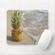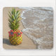 Tropische Ananas auf dem Strand Sand mit roten Sternen Sonnenbrillen am Wasser.