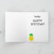 Pineappleicious ist eine lustige Geburtstagskarte für alle, die Ananas Lieben. Es ist mit Ananas im Stil eines Cartoon dekoriert und das Innere kann nach Ihrem Namen und Gruß angepasst werden. Die Karte hat einen grünen Hintergrund mit einem gelben Rand und die Ananas ist in Gelb- und Grüntönen gehalten.