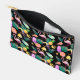 Ein Tukanvogel, ein rosa Flamingo und ein heller Ananas vereinen sich mit einer Eistüte, einer Eiscreme, Eisbars, einem hellen Grapefruitschnitt und einer Zitrone, mit goldenen Sternen und grünen Palmen-Blätter, um ein lustiges tropisches Muster auf der Vorderseite dieses Beutels zu bilden. Die mehrfarbigen, hellen Bilder werden auf einem dramatischen schwarzen Hintergrund platziert. Ihre zweistellige Monografie ist auf der Rückseite rosa, zusammen mit einem Bild des Flamingos, Palmenblattes und Ananas. Hell, bunt und lustig!