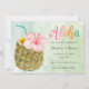 Tropische Hochzeit Save the Date-Karte bietet farbenprächtige "Aloha"-Schrift und eine Aquarellananas mit einer rosa Hibiskus-Blume auf einem grünen und blauen Aquarellhintergrund. Ideal für Strand, tropische Inseldestination, hawaiianisches luau, Hochzeiten an der Küste und im Sommer. Original-Kunstwerk KL Stock.
