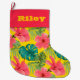 Exotische Hibiskus-Blume, Monstera-Blätter und Palmenfronten auf hellgelbem Hintergrund, lebendig bedruckt und personalisiert, egal wie Sie sich für diese tropischen Strümpfe Weihnachten in zwei Größen. Wählen Sie aus 3 verschiedenen Materialstilen. Wir haben für doppelseitigen Druck entwickelt, aber Sie können eine solide rote Rückseite auswählen. (Rote Manschette oben ist DRUCKT, kein separates Stück und Sie können die Farbe ändern.) **Personalisieren Sie Ihren Strumpf und fügen Sie ihn Ihrem Warenkorb für jeden Namen, den Sie erstellen, hinzu.