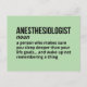 Anästhesistin - Funny Job Definition Diese unglaublich witzig Anästhesistin Job Definition Postcard ist ein nachdenkliches und leichtherziges Geschenk für jeden in der Medizin. Ideal für Anästhesiologen, CRNAs, Ärzte und Absolventen der medizinischen Fakultät. Eine gute Möglichkeit, Spaß in die Anzeigetafeln am Arbeitsplatz oder in Studentenschlafzimmern hinzuzufügen.