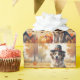 Ein Aquarellbild eines fröhlichen Hundes inmitten eines Haufen lebendiger Herbstlaub, umgeben von winzigen Kürbissen und verstreuten Eichhörnchen. Der Hund trägt einen kleinen Pilgerhut und strahlt vor Freude aus, um den Geist des Erntedanks zu erfassen. Im Hintergrund sorgen weiche Erntefelder und goldfarbene Bäume für eine friedliche Landschaft. Die sanfte Struktur und die warmen, gedämpften Herbsttöne verleihen der Szene ein gemütliches, nostalgisches Gefühl, das perfekt ist, um die Schönheit der Saison zu feiern.