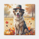 Ein Aquarellbild eines fröhlichen Hundes inmitten eines Haufen lebendiger Herbstlaub, umgeben von winzigen Kürbissen und verstreuten Eichhörnchen. Der Hund trägt einen kleinen Pilgerhut und strahlt vor Freude aus, um den Geist des Erntedanks zu erfassen. Im Hintergrund sorgen weiche Erntefelder und goldfarbene Bäume für eine friedliche Landschaft. Die sanfte Struktur und die warmen, gedämpften Herbsttöne verleihen der Szene ein gemütliches, nostalgisches Gefühl, das perfekt ist, um die Schönheit der Saison zu feiern.