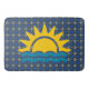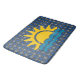 Eine Gemusterte Badematte in blauem Nautikblau mit Sonnenstrahlen und Wellengang, die sich perfekt für die Badezimmerdekoration am Strand oder am See eignen.