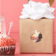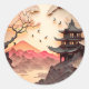 Ein Set von wunderschönen, braunen, runden Aufklebern mit einer Papierausschnitt-Szene, die antikes chinesisches Gebäude, Bäume, Berge und See darstellt.