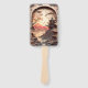 Ein wunderschönes braunes Set von Handfans mit einer Ausschnitt-Szene, die antikes chinesisches Gebäude, Bäume, Berge und See darstellt.