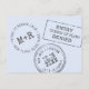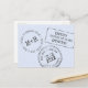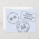Lichtblaues und graues Reisethema "Ändern des Datums" Postkarte mit benutzerdefiniertem Textdesign der Passtexte, um eine Hochzeit in Urlaubsort Aufschub, Umplanung oder neuen Ort anzukündigen. Ein subtiler Texturhintergrund überlagert jede beliebige Farbe Ihrer Wahl und imitiert ein Passseitenmuster, und alle Formulierungen und Texte innerhalb der Briefmarke für die Einreise in den Ehe-Pass können personalisiert sein, aber wir haben einige humorvolle Ideen aufgenommen, um den Stress der Situation für Reisebeschränkungen und annullierte Flüge zu verringern.