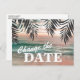 Das Strandziel ändert die Dattelkarten mit einer tropischen Sonnenuntergang Palmen Strand Einstellung, String Tinkle Lichter und eine neue Hochzeitsplanvorlage, die leicht zu personalisieren ist.