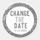 Eine moderne Änderung des Datums-Aufklebers mit einem silbernen Glitzer-Ringrahmen. Die Umschlag Aufkleber können genutzt werden, um Ihre Umbauten in den Bereichen Hochzeit, Verlobung, Brautparty, Babydusche, Party Feiertag zu teilen.
