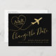 Black and Gold Travel Theme Hochzeit in Urlaubsort Ändern Sie die Datum Ankündigung Postkarte mit einem lustigen und niedlichen Gedicht und Gold Flugzeug Monogramm mit Initialen. Lass deinen Gästen, dass dein Hochzeitsort oder dein Hochzeitstermin (oder beides) in modernen Kalligraphieskripten-Schriftart und einer Kombination aus verschiedenen Typografien umgestellt, verschoben oder geändert werden muss. Besuchen Sie den Paper TraubenDestinations Zazzle Designer Shop für mehr Reise und Strand Thema Hochzeit Einladung, speichern Sie die Daten und Aufschub Ankündigungen. Das Gedicht auf der Rückseite ist 100% Original-Schreiben ©2020 Paper Traupe Destinations, und wird nicht kopiert oder anderweitig verwendet werden. Bitte wenden Sie sich an den Designer, wenn Sie Fragen zur Übertragung dieses Designs oder Gedichts auf andere Objekte und Designs haben.