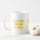 Das Design der Tasse zeigt das Zitat "Die Welt verändern" in einem fett geschriebenen Schriftart vor einem lebendigen, gestuften Hintergrund von Blues und Grüntönen. Die Tasse ist eine Keramik mit einem komfortablen Griff und ist sowohl für Blickfang als auch für Hobby konzipiert.