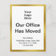 Front: Ein Bild ist oben. Sie können das Bild durch Ihr Logo ersetzen. "Unser Büro hat sich bewegt" ist in der Mitte. Vier Zeilen schwarzen Bildschirmtext für Ihre neue Adresse sind unten. Die Vorderseite hat einen goldenen Rahmen für Imitate (nicht für Folien). Zurück: Die Rückseite ist leer.