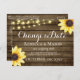 Ändern Sie das Datum rustikale Stallhochzeit Thema Postkarte mit hübschen Sonnenblumen Scheunenholz und Saitenleuchten. Bearbeiten Sie Text wie gewünscht.