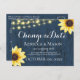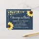 Ändern Sie das Datum rustikale Stallhochzeit Thema Postkarte mit hübschen Sonnenblumen über rustikal blauen Scheunenholz und Saitenleuchten. Bearbeiten Sie Text wie gewünscht.