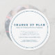 Änderung des Plans einfache Text klassische dunkelblaue und weiße Karte mit einem Foto auf der Rückseite. Lass deinen Gästen, dass deine Hochzeit oder andere Veranstaltung wegen unvorhergesehener Umstände abgesagt oder verschoben wurde.