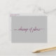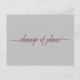 Diese einfache Postkarte ist eine elegante und raffinierte Art, Ihre Gäste lassen wissen, wenn Sie in der unglücklichen Lage sind, Ihre Hochzeitspläne zu ändern oder zu verschieben. Die Vorderseite ist grau mit Cassis lila oder Magenta Text, der "Planänderung" in eleganter Schrift-Kalligrafie liest, und die Rückseite hat Platz für eine individuelle Note, wo Sie Ihren Gästen die Situation erklären können.