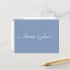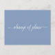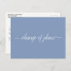 Diese einfache Postkarte ist eine elegante und raffinierte Art, Ihre Gäste lassen wissen, wenn Sie in der unglücklichen Lage sind, Ihre Hochzeitspläne zu ändern oder zu verschieben. Die Vorderseite ist eine hellblaue Farbe und liest in eleganter weißer Schriftzeichen "Plan-Wechsel", und die Rückseite hat Platz für eine individuelle Note, wo Sie Ihren Gästen die Situation erklären können.