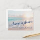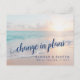 Beach Hochzeit in Urlaubsort Postponement Postkarte, um Ihre Gäste lassen wissen, dass Ihr Hochzeitsort oder Datum (oder beides) neu geplant oder geändert werden muss, aus irgendeinem Grund überhaupt. Die Formulierung ist vage genug, sodass Sie nicht den Grund teilen müssen, oder bearbeiten Sie den Text, um eine vollständige Erklärung, wenn Sie möchten. Der wunderschöne Sonnenuntergang am Strand bietet hübsche Meereswellen und moderne Kalligraphie-Skript-Schriftart und eine Kombination aus verschiedenen Typografien. Besuchen Sie den Paper Grape Destinations Zazzle Designer Shop für weitere Reise- und Strand Thema Hochzeit Einladung, speichern Sie die Daten und Aufschub Ankündigungen.