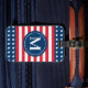 Reisen Sie mit diesem mit Monogramm Gepäckanhänger im patriotischen Stil. Das Design der USA ist inspiriert mit US Flagge in den Farben Rot, Weiß und Blau. Personalisieren Sie das benutzerdefinierte Monogramm mit dem Anfangsbuchstaben Ihres Familiennamen.