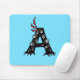 Anfangsbuchstabe A scherzt mousepad mit einer Cartoonillustration eines niedlichen Monsters mit dem Körper, der einen Hauptstadtsbuchstaben A über kundengerechtem blauem Hintergrund bildet. Dieser lustige Charakter hat viele Augen und macht einen lustigen Ausdruck, der seine Zähne zeigt. Er hat sogar kleine Greifer auf seinen Tatzen und drei rote Federn auf seinem Kopf, die seine schrullige Persönlichkeit aufdecken.