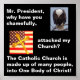 Auf diesem Poster stehen zwei Fotos. Einer ist ein amerikanischer Adler und der andere ein antikes katholisches Crucifix über der Flagge der Vereinigten Staaten. Das Poster hat einen schwarzen Hintergrund und diese Worte in weiß: "Herr Präsident, warum haben Sie unnachgiebig, beschämend, meinen Glauben und meine Kirche angegriffen?" "Die katholische Kirche besteht aus vielen Menschen, zu einem Körper Christi!"