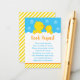 Diese niedliche und lustige Buchfrachtkarte bietet eine zauberhafte gelbe Ente und ein Entenlein in weißen Seifenbadebläschen auf hellblauem Hintergrund mit orangefarbenem Band und gelben Streifen. Der Text kombiniert handgeschriebene Skripte mit serifenlosen Schriftart für ein stilvolles und modernes Design. Das ist perfekt für eine Babydusche.