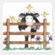 Eine Kuh pinkelt über die Zaun-Aufkleber.