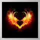 Engel Feuerherz mit flammenden Flügeln auf schwarzem Hintergrund.