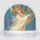 vintage art with painting of an angel with angelic expression, beautiful flowing dress and golden harp in blues and beige.
