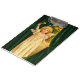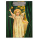 Vintage illustration of a lovely angel with white feather wings and golden hair, ringing the bell for Christmas time. On the background behind the dark green curtains is a nostalgic Christmas tree with bright burning candles.