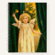 Vintage illustration of a lovely angel with white feather wings and golden hair, ringing the bell for Christmas time. On the background behind the dark green curtains is a nostalgic Christmas tree with bright burning candles.